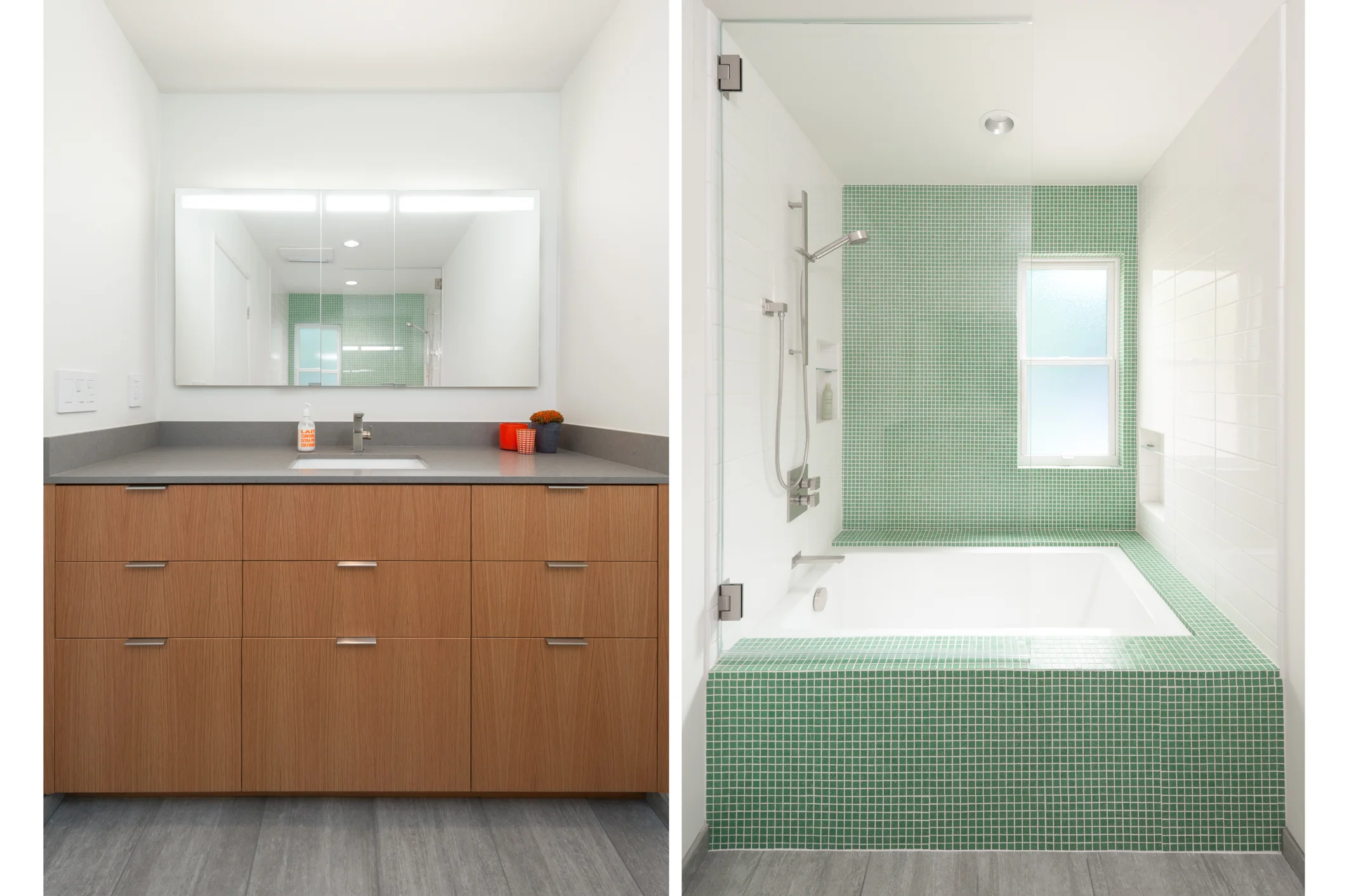 This creative couple’s dream was to add a spa-like atmosphere to their existing Master and Guest bathrooms offering both relaxation and rejuvenation at the same time. The Master bathroom received a under-mount tub in lieu of the existing small shower and a spacious shower did away with the small tub in the Guest bath. New white oak cabinets with flat drawer panels adorn both spaces. The neutral color scheme of the Guest bathroom emits an elegant, sophisticated feel, whereas the pop of the green tile in the Master adds a pleasing and harmonious touch to the space.